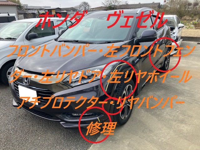 千葉市|千葉市若葉区|ホンダ ヴェゼル フロントバンパー 左フロントフェンダー 左リヤドア 左サイドシルガーニッシュ 左リヤホイールアーチプロテクター リヤバンパー 板金 鈑金 修理 キズ へこみ キズ修理 へこみ修理 取替 交換 保険 保険修理