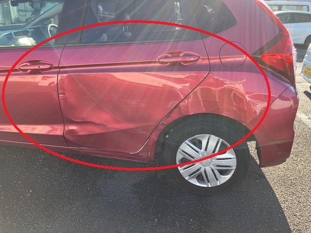 お客様のお話しですと、電信柱が近付いてきたそうです。左側側面、至ると事がデコボコになってしまっております。(-_-;)