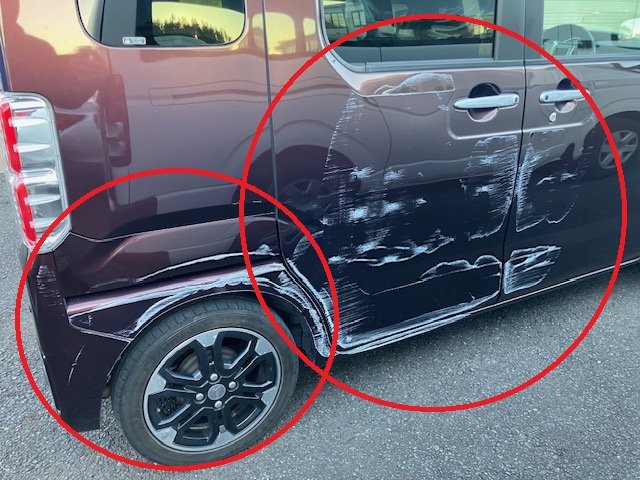 | 修理の箇所・サービス内容 | 右フロントドアパネル・右リヤドアパネル・右センターピラー・右クォーターパネル・右テールレンズ・リヤバンパー修理 |