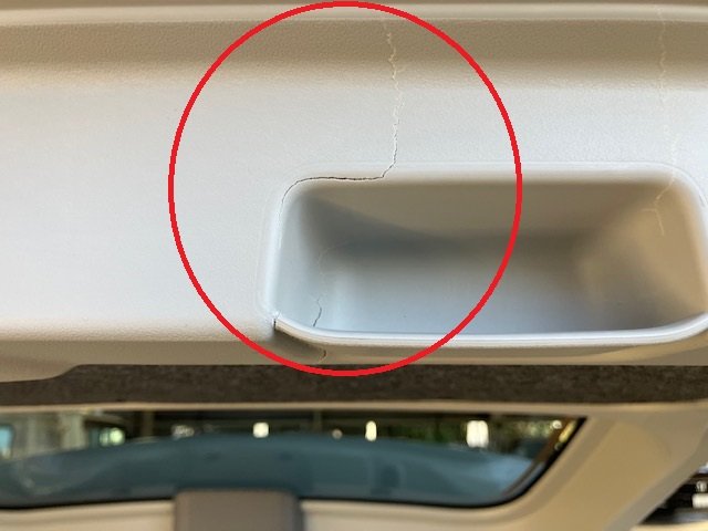 お客様のお話しですと、追突されたらしいです。確認しますと、バックドアが樹脂でできていますので割れてしまっております。その他各部に色々な損傷などが見られます。(-_-;)