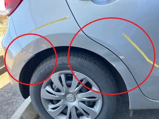 お客様のお話しですと、駐車場を出る際に、低い位置にポールにがあり、気付かずハンドルを切ってしまった為、キズがついてしまったそうです。キズがしっかりできてしまっております。