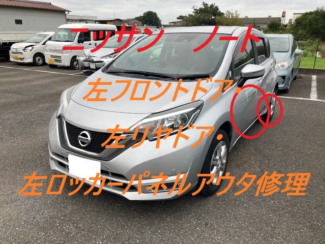 千葉市|千葉市若葉区|ニッサン ノート 左フロントドア 左リヤドア 左ボデーサイドシル 左アウタリヤホイールハウス 板金 鈑金 修理 キズ へこみ キズ修理 へこみ修理 取替 交換 保険 保険修理