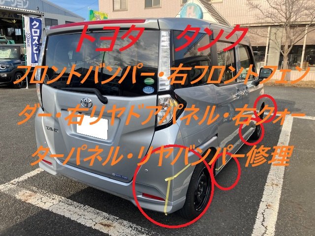 千葉市|千葉市若葉区|トヨタ タンク フロントバンパー 右フロントフェンダー 右リヤドアパネル 右クォーターパネル リヤバンパー 板金 鈑金 修理 キズ へこみ キズ修理 へこみ修理 取替 交換 保険 保険修理