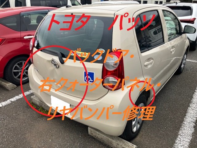 佐倉市|トヨタ パッソ バックドア 右クォーターパネル リヤバンパー 板金 鈑金 修理 キズ へこみ キズ修理 へこみ修理 取替 交換 保険 保険修理