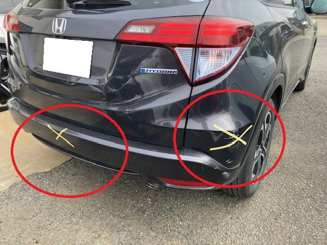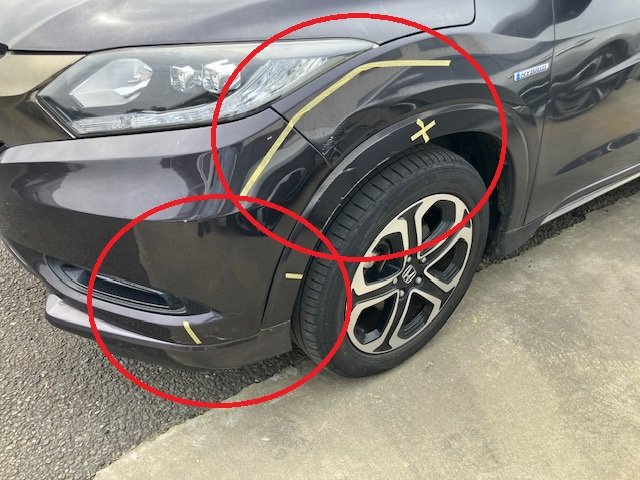 佐倉市|ホンダ ヴェゼル フロントバンパー 左フロントフェンダー 左リヤドア 左サイドシルガーニッシュ 左リヤホイールアーチプロテクター リヤバンパー 板金 鈑金 修理 キズ へこみ キズ修理 へこみ修理 取替 交換 保険 保険修理