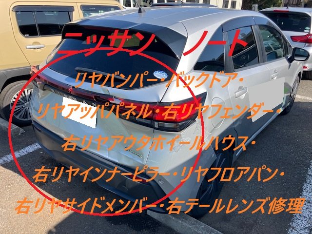 佐倉市|ニッサン ノート リヤバンパー バックドア リヤアッパパネル 右リヤフェンダー 右リヤアウタホイールハウス 右リヤインナーピラー リヤフロアパン 右リヤサイドメンバー 右テールレンズ 板金 鈑金 修理 キズ へこみ キズ修理 へこみ修理 取替 交換 保険 保険修理