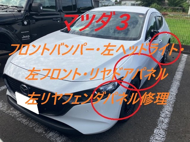 佐倉市|マツダ マツダ3 フロントバンパー 左ヘッドライト 左フロントフェンダー 左フロントドア 左サイドミラー 左リヤドア 左サイドステップモール 左リヤフェンダ 左フロントサスペンション 左フロントタイヤ・ホイール・ホイールキャップ 板金 鈑金 修理 キズ へこみ キズ修理 へこみ修理 取替 交換 保険 保険修理