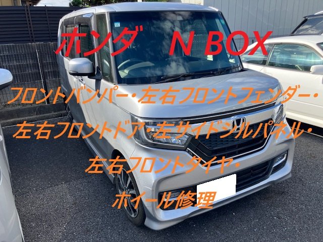 佐倉市|ホンダ N BOX フロントバンパー 右フロントフェンダー 左フロントフェンダー 右フロントドアパネル 左フロントドアパネル 左フロントアウトサイドシル 左スライドドアセンターレールカバー 左右フロントアルミホイール、タイヤ板金 鈑金 修理 キズ へこみ キズ修理 へこみ修理 取替 交換 保険 保険修理