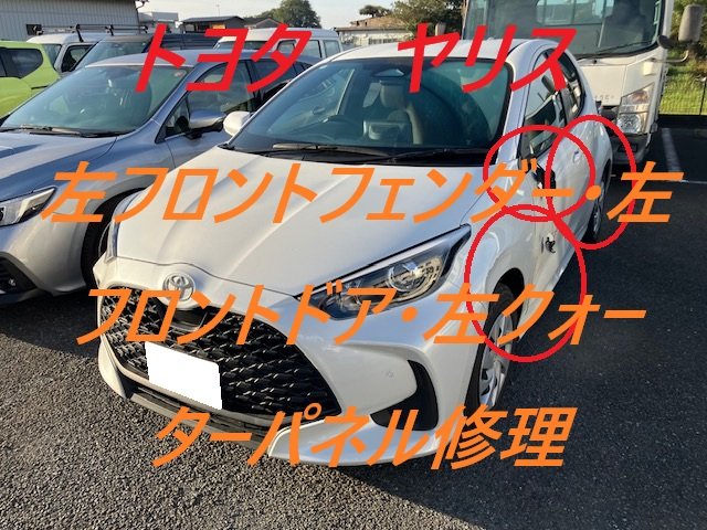 佐倉市|トヨタ ヤリス 左フロントフェンダ 左フロントドア 左ドアミラー 左クォーターパネル 板金 鈑金 修理 キズ へこみ キズ修理 へこみ修理 取替 交換 保険 保険修理