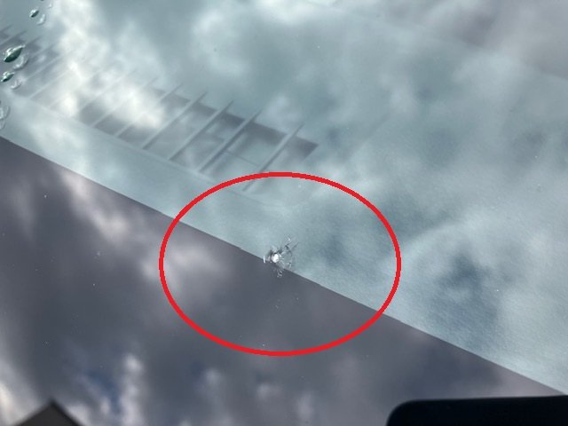 お客様のお話しですと、国道を走行中に対向車から何かが飛んできて「ピシ」と音がしてヒビが出来てしまったそうです。(-_-;)