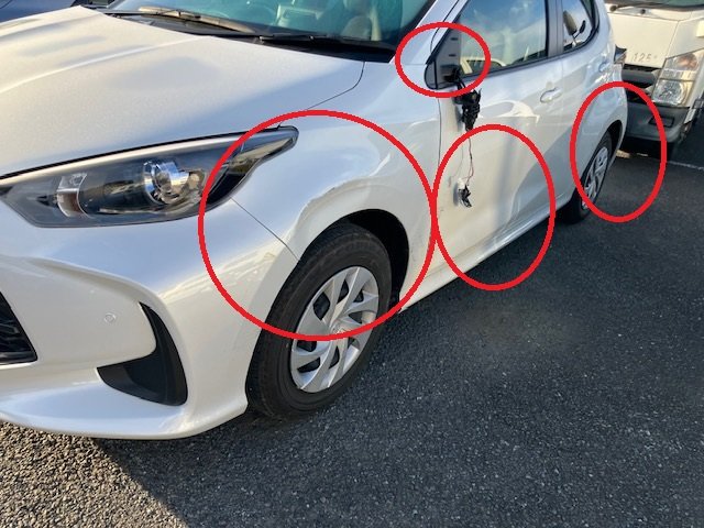 佐倉市|トヨタ ヤリス 左フロントフェンダ 左フロントドア 左ドアミラー 左クォーターパネル 板金 鈑金 修理 キズ へこみ キズ修理 へこみ修理 取替 交換 保険 保険修理