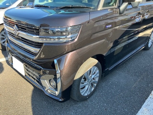 佐倉市|スズキ スペーシア フロントバンパー ラジエータグリル 左ヘッドライト ボンネット 左フロントフェンダパネル 左フロントドアパネル 板金 鈑金 修理 キズ へこみ キズ修理 へこみ修理 取替 交換 保険 保険修理