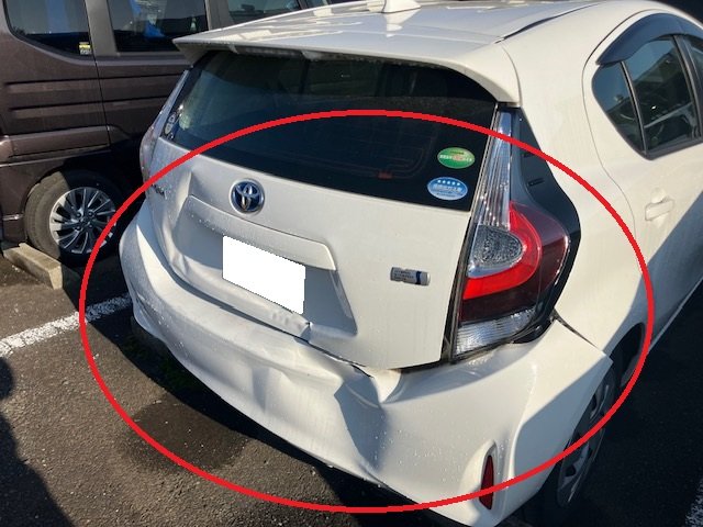 佐倉市|トヨタ アクア リヤバンパー バックドアパネル ボデーロワバックパネル 左右クォーターパネル リヤフロアパン 左右リヤフロアサイドメンバー バックドアウインドガラス 左テールレンズ 板金 鈑金 修理 キズ へこみ キズ修理 へこみ修理 取替 交換 保険 保険修理