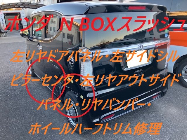 佐倉市|ホンダ N BOXスラッシュ 左リヤドアパネル 左サイドシルピラーセンタ 左リヤアウトサイドパネル リヤバンパー ホイールハーフトリム 板金 鈑金 修理 キズ へこみ キズ修理 へこみ修理 取替 交換 保険 保険修理