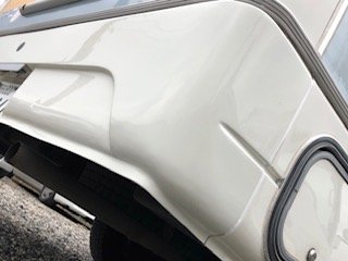 キャンピングカーです。キャンピングカーの鈑金作業の場合、損傷個所や状態により、車内の設備等に不具合が出る場合があるので、鈑金作業をお受けできない事があります。