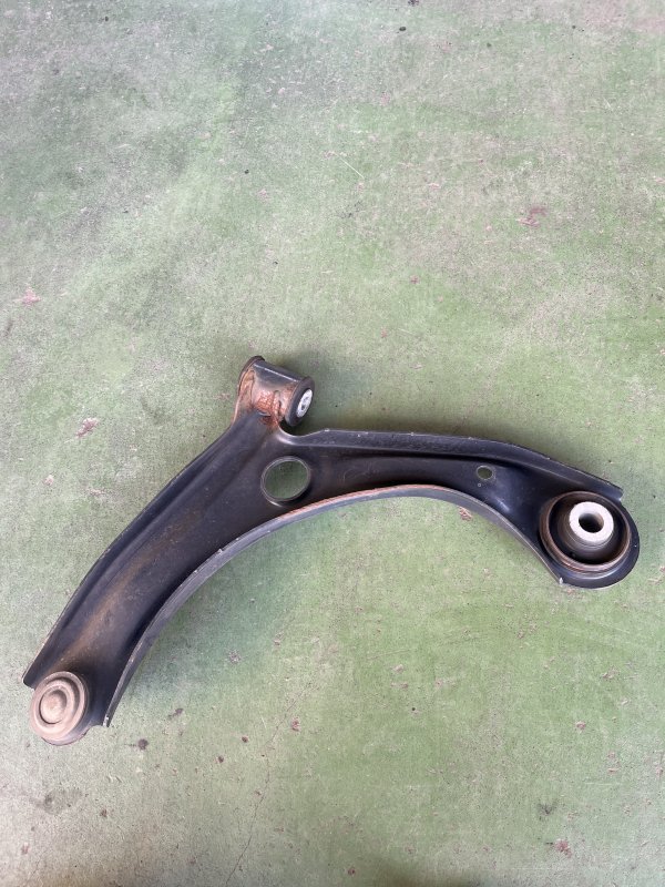 新品と比べるとロアアームが変形しているのが確認できます。車両に組み付け後サイドスリップとハンドルセンターを調整し、右に流れて行かないことを確認し作業終了になります。