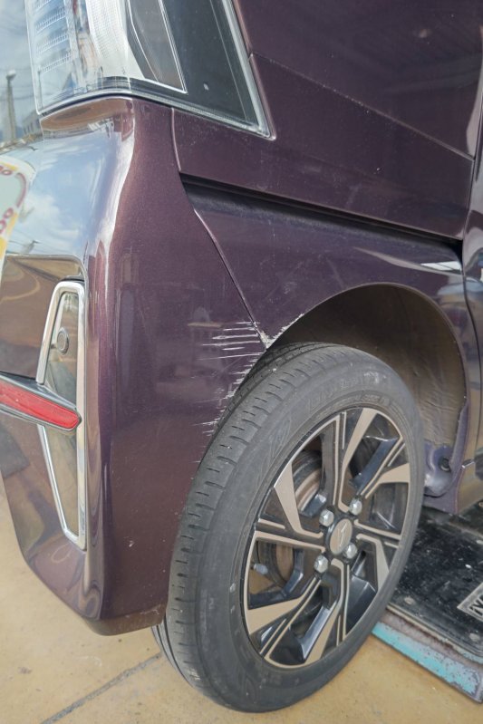 新潟県上越市|スペーシア(スズキ)のキズ・へこみ直し事例(右側クォーターパネル変形、キズ・ヘコミ修理、リヤバンパー交換作業)