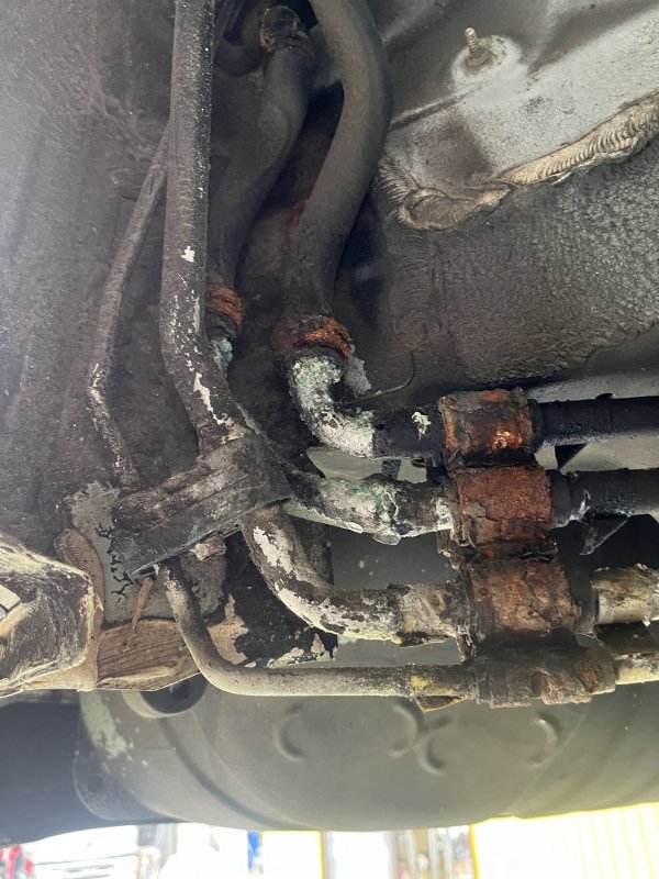 エアコンガスを補充したがすぐ効かなくなったと問い合わせがあり点検するとリアエアコンのパイプがサビにより腐食して穴があいていた為交換を実施します。