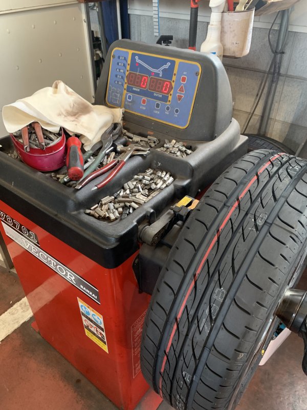 タイヤ組み付け後、ホイールバランスの調整。