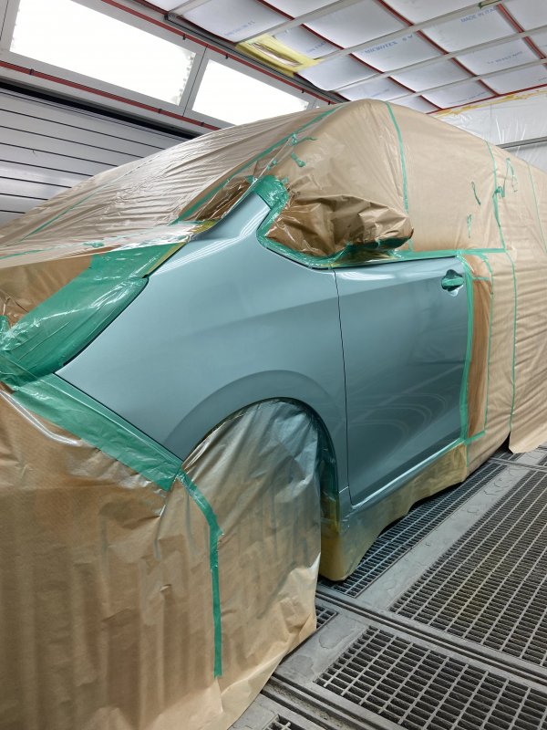 フロントフェンダーとフロントドアのヘコミを鈑金修理します。
