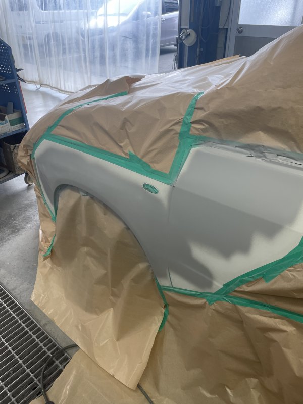 鈑金し、丁寧にマスキングしてサフェーサーを塗布します。