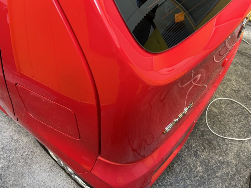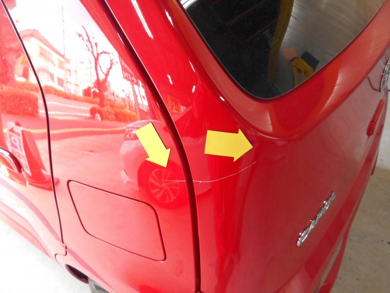 リヤフェンダーからバックドアにかけて1本線のキズと。。。