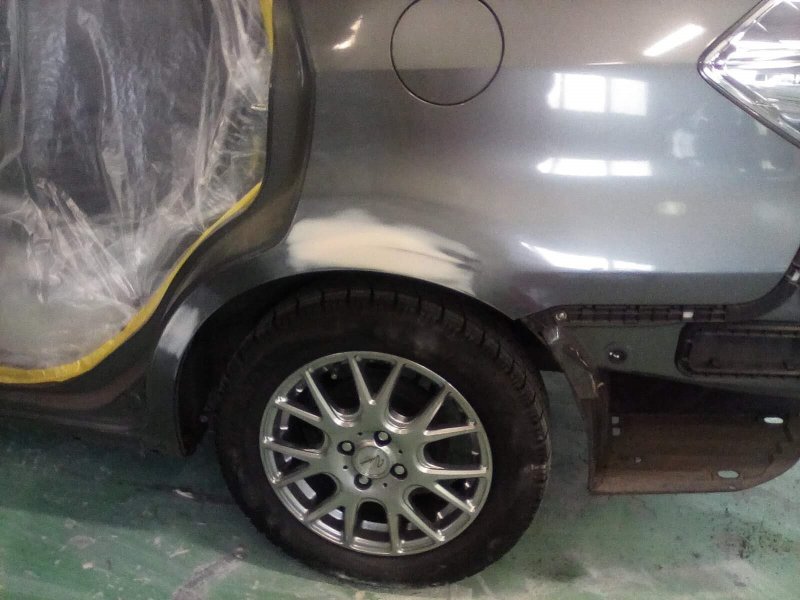 左前ドア・左後ろドア・サイドスポイラーは交換、左クォーターとリアバンパーは修理で作業を行いました。