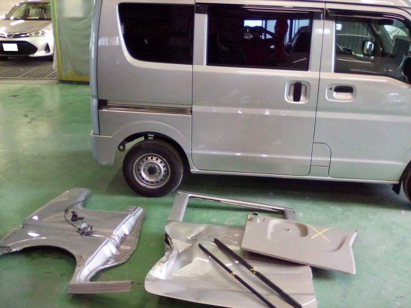 【川崎市・横浜市・狛江市・世田谷区・目黒区・品川区・大田区】 ミニキャブバン 右前ドア/右後ろスライドドア/右サイドステップ/右クォーター キズへこみ修理