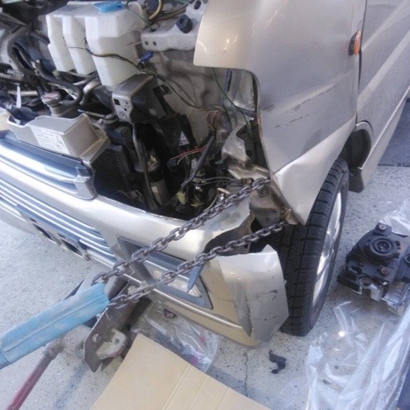 エブリバンの修理です。バンパー割れてるだけでなく車体自体が変形していました。車体を固定し、チェーンをかけて引き出し元のところまで戻してバンパーが元通りにできました!