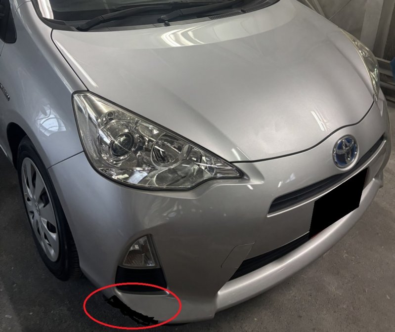 山口県岩国市|アクア(トヨタ)のキズ・へこみ直し事例(鈑金塗装修理:府フロントバンパーキズ凹み直し、フロントフェンダーパネル鈑金塗装)