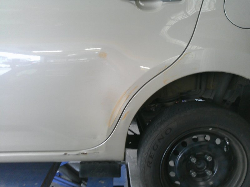 お客様より「狭い道を左折した際、ブロック塀に左側のリヤドアからクォーターパネルにかけて擦ってしまった」とのご相談をいただきました。高崎市内で修理店をお探しの中、弊社へお問い合わせをいただき、すぐにご入庫・修理の運びとなりました。