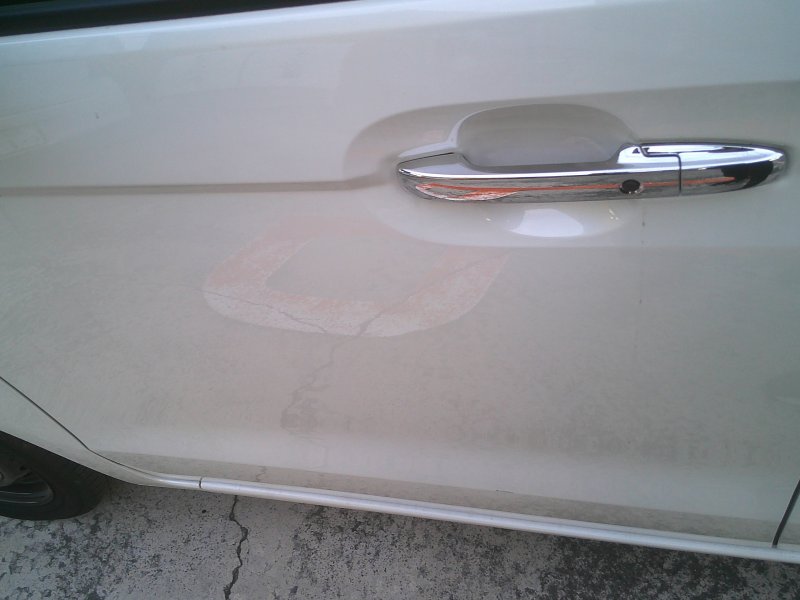 損傷状況: フロントドアパネルに大きなへこみとキズ