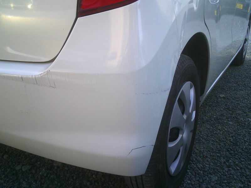 お客様よりお車を拝見させていただいたところ、リヤバンパーの角部分に比較的深い擦り傷と、一部にへこみが確認されました。