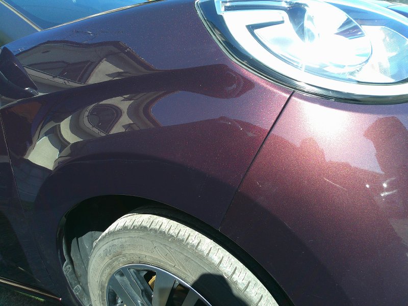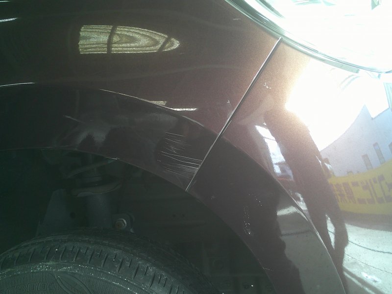 お客様からは、「駐車場に前から停めようとした際に、前方にあったポールに接触してしまい、フロントフェンダーにヘコミと傷ができてしまった。すぐに綺麗に直してもらいたい」とご相談をいただきました。
