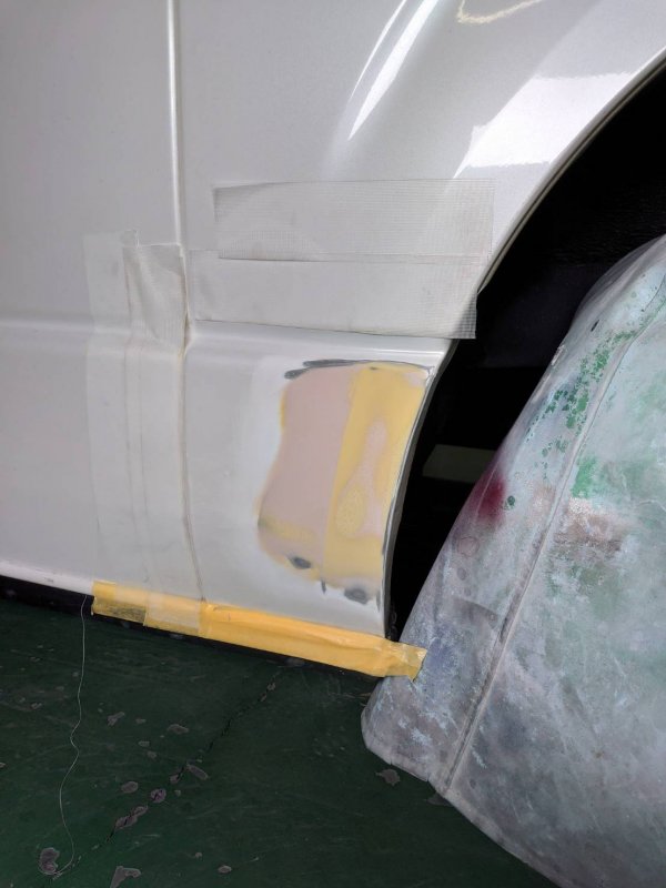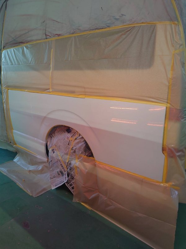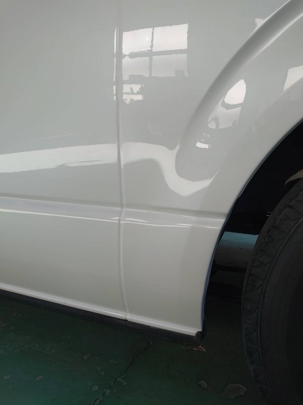 ハイエースのような大きな車の場合、クオーターパネルは面積が広く、キズやヘコミが目立ちやすい場所でもあります。お客様とご相談し、今回は交換ではなく、熟練の技術で修復する板金修理にてご対応させていただきました。