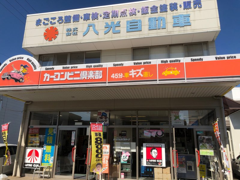 八光自動車は、地域のお客様に愛され、長年の実績と信頼を築いてきたお店です。 安心の認証工場として、キズ・ヘコミの修理はもちろん、車検、整備、日常のメンテナンス、さらには新車・中古車販売やリースまで、お車に関することなら何でも幅広く対応可能です。