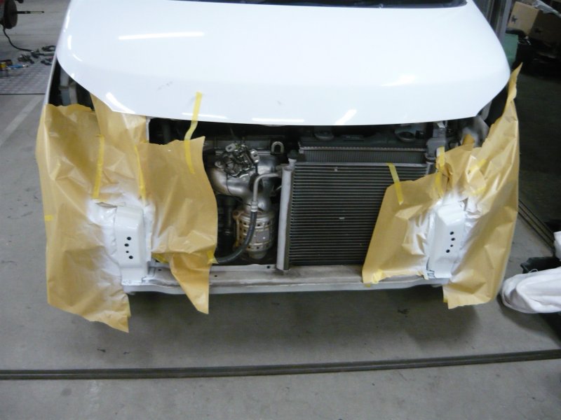 フロントバンパーと左右ヘッドライト、フロント骨格部分(コアサポート)は交換させて頂き、左右サイドメンバーは鈑金塗装修理で作業致しました。