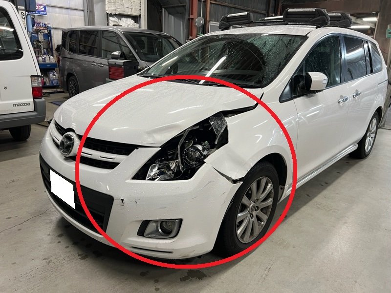 【川崎市・横浜市・大田区・世田谷区・品川区・目黒区】 MPV ボンネット/フロントグリル/左ヘッドライト/左フェンダー/フロントバンパー キズへこみ修理