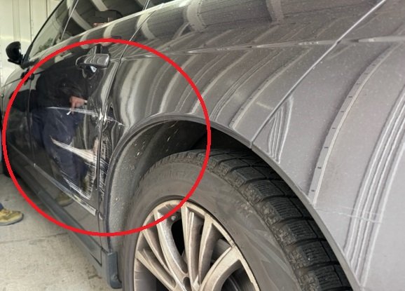 お車を確認させて頂くと、左後ろドアと左クォーターに大きなキズへこみが付いているのを確認致しました。ポール気付かず接触してしまわれたそうです。