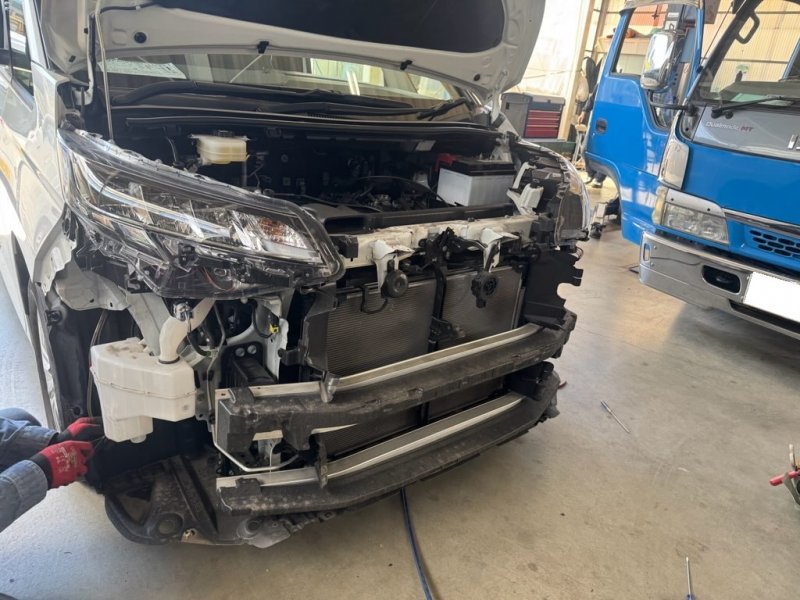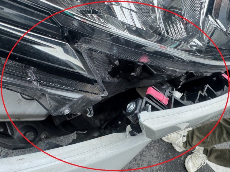 お車を確認させて頂くと、フロントバンパーの右側部分が剥がれており、右ヘッドライトのひび割れが発生していました。