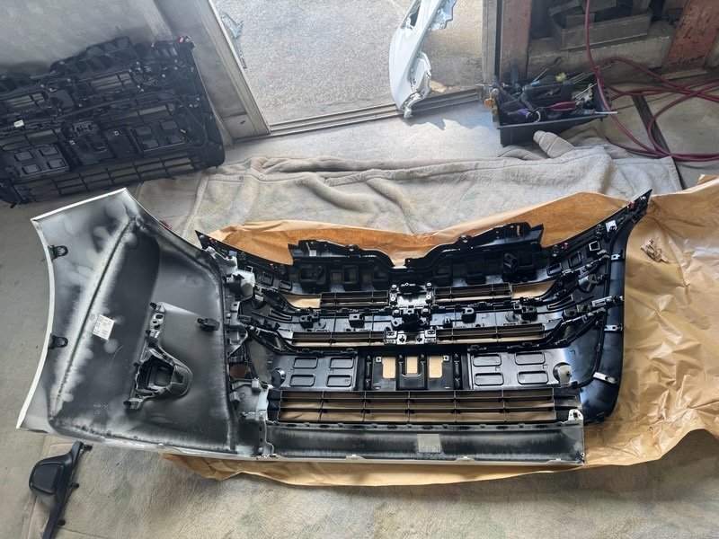 新品のフロントバンパーは調色したカラーで塗装し、クリアを噴きかけツヤと光沢を出し乾燥して取付け致しました。