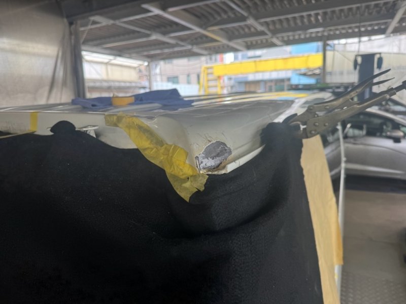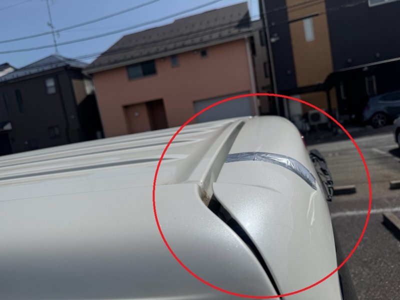 お車を確認させて頂くと、バックドアの左側部分にへこみがあり、ルーフ部分にもへこみキズが付いていました。