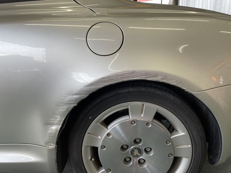 お客様は、走行中にぶつけてしまい、ディーラーや他の鈑金工場に見積もりを依頼されたそうなのですが、金額が高くて困っていらっしゃいました。そんな時、以前から当店をご存知だったそうで、ダメもとで電話をかけてくださったとのこと。