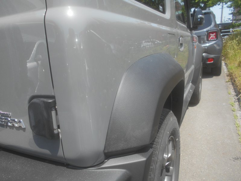 リアフェンダーの損傷です。板金修理で施工しまして修理完了です。ジムニーなどスズキのお車は当社アリーナ店の正規ディーラーのため、得意です。スズキ車以外も大丈夫ですので、どしどしご相談ください。