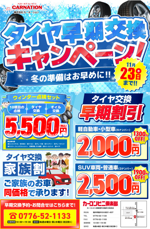 福井県 福井市 タイヤ交換 タイヤ早期交換 スタッドレスタイヤ タイヤ交換キャンペーン 早期割引 軽自動車 普通車