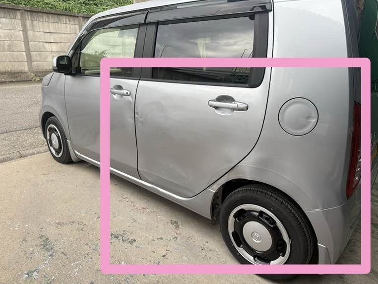 愛知県名古屋市南区| Nワゴン(ホンダ)のキズ・へこみ直し事例(左フロントドア交換、左リヤドア交換、左クォーターパネル交換、リヤバンパー交換)