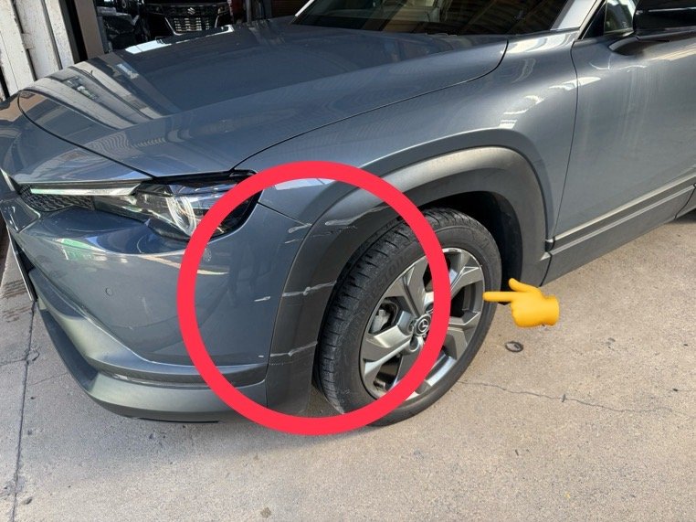 愛知県名古屋市南区|MX-30(マツダ)のキズ・へこみ直し事例(フロントバンパー修理、左フロントフェンダー修理、左フロントフェンダーモール交換、左フロントタイヤ&アルミホイール交換)
