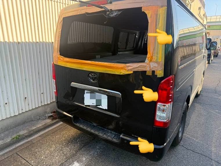 愛知県名古屋市南区|ハイエース(トヨタ)のパーツ交換・取付事例(リヤバンパー交換、バックドア交換、バックドアガラス交換、バックパネル修理)