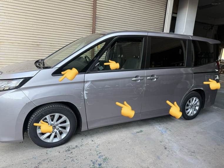 | 修理の箇所・サービス内容 | 右フロントサイドバンパー交換、左フロントフェンダー交換、左フロントドア交換、左ドアミラー交換、左スライドドア修理、左クォーターパネル修理 |