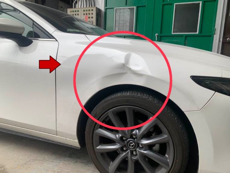 愛知県名古屋市南区|MAZDA3(マツダ)のキズ・へこみ直し事例(右フロントフェンダー交換、右フロントホイール交換)